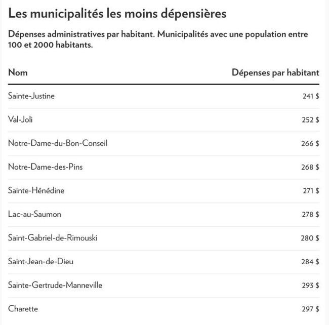 L'article publiait un palmares des municipalités les moins dépensières pour l'administration selon la population. Nous avons constaté avec fierté que Val-Joli y figurait en 2e place pour les municipalités de 100 à 2000 habitants.